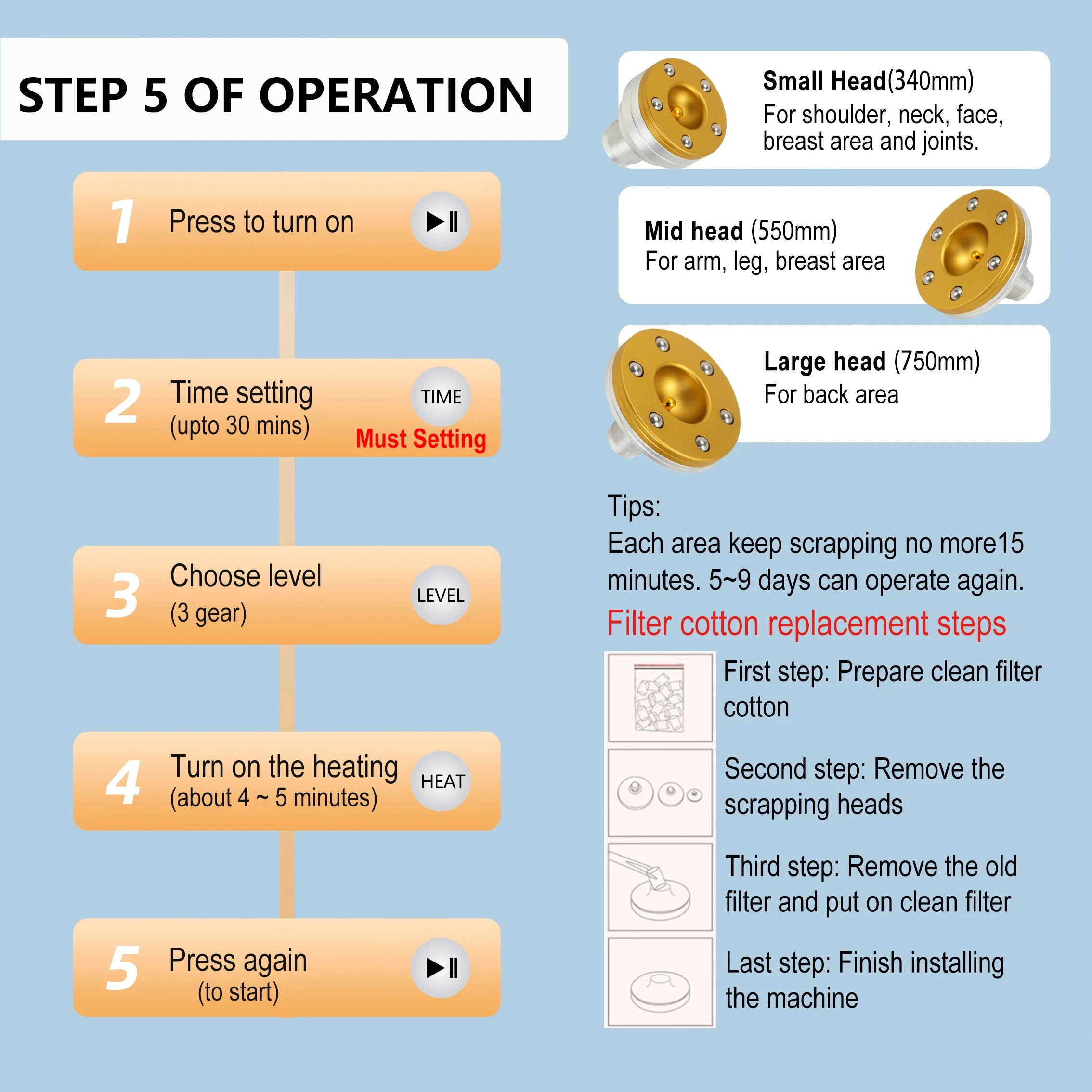 3.3 medical titanium alloy scraping heads specifically for different parts of the body are safe, stable and replaceable, anti-allergic, anti-rust and anti-bacterial, and better promote the body's heat circulation.