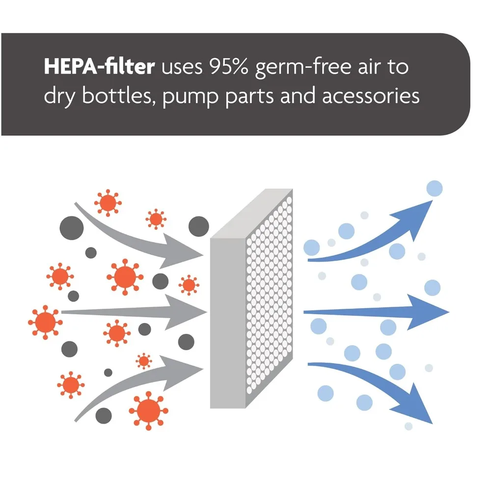 • DRIES 33% FASTER THAN OTHER STERILIZER DRYERS: Automatically sterilizes & dries bottles, breast pump parts, pacifiers, teethers, sippy cups and other accessories from any brand in 1 easy step, saving you time; Dries in 30 min vs 45 min for others