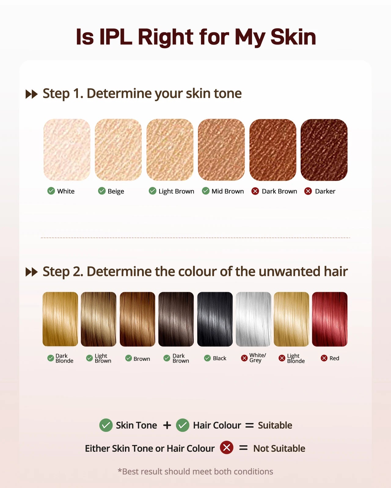 ● IPL epilator is suitable for white to light brown skin and black to light brown body hair. However, this product should not be used on: Tanned, tattooed and dark-spotted skin, white, gray or red body hair (see skin tone chart)