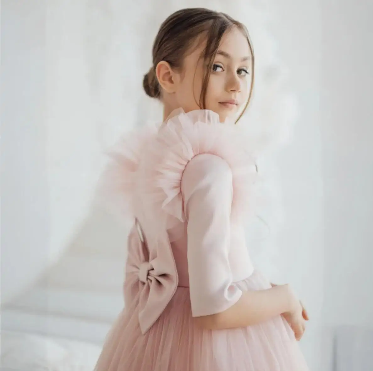 Pink Flower Girl Dresses Tulle With Bow Half Sleeve For Wedding Birthday Party Banquet Princess Gowns