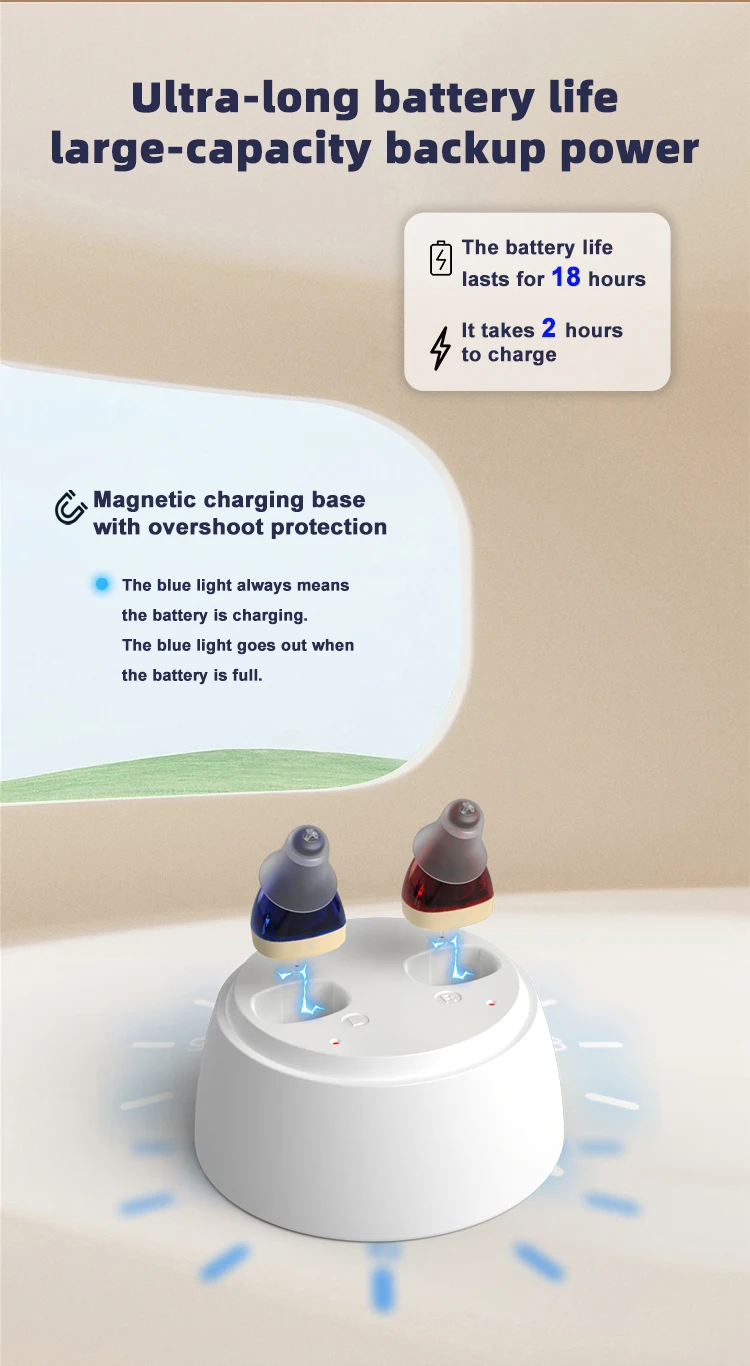 2. Digital display rechargeable box charging: Your hearing aid can be charged with a detachable charging box. And there is a battery on the charging box to light up the display. (You need to charge the detachable charging box first.) It is easy to carry, saving you the trouble of constantly buying button batteries. You can intuitively see the remaining power, which is convenient for you to charge in advance.